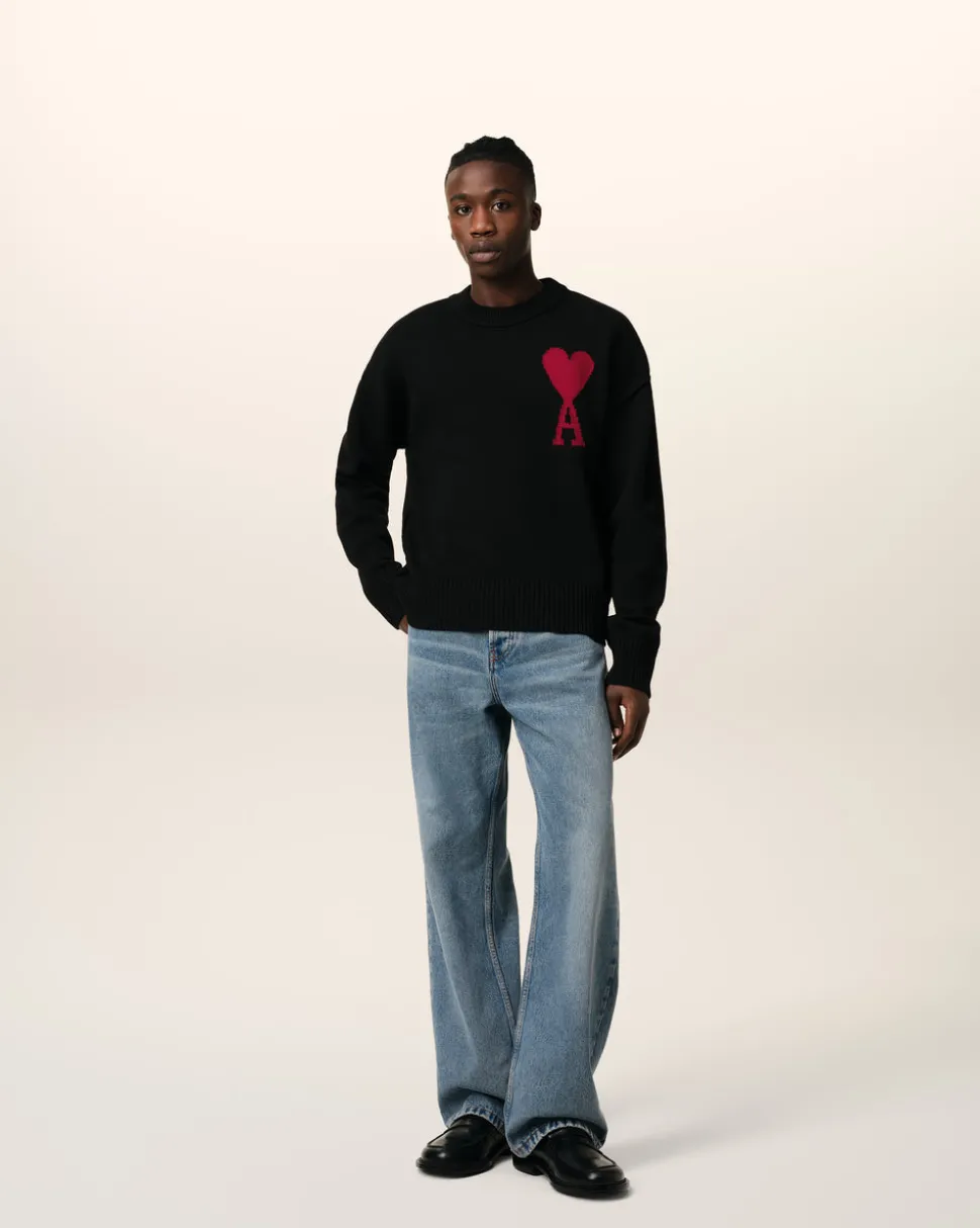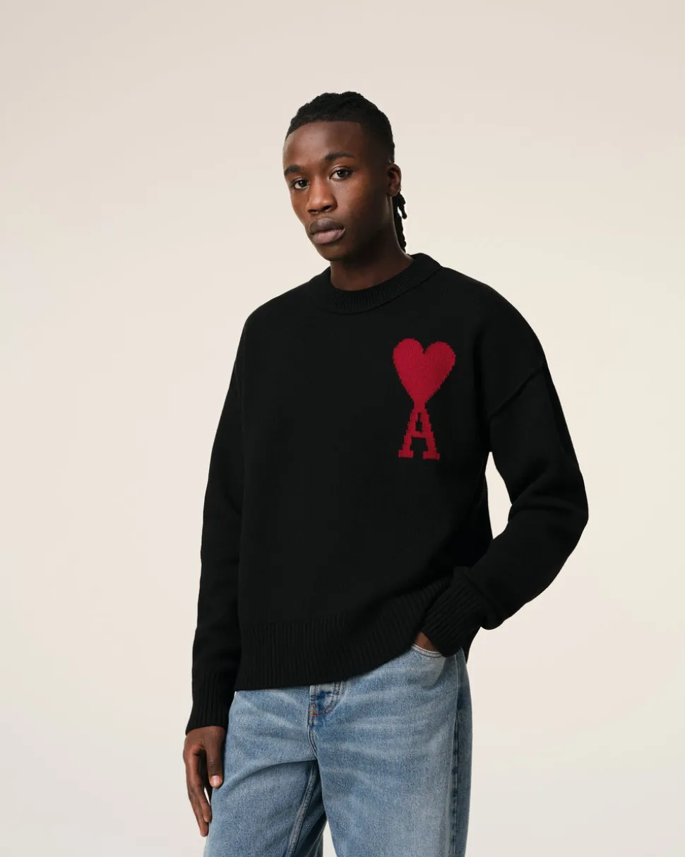 Logo Ami de Coeur rouge tricoté en intarsia sur la poitrine